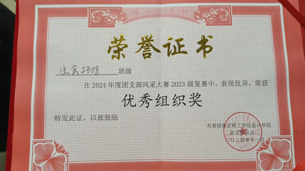 团支部风采大赛中,大家团结一心,默契配合,打破常规,创新思想,实现自我提升。大家于集体中享温暖,携手共进,为实现光明的未来奋勇拼搏! 班级学业氛围浓厚,整体成绩靠前。同学们学习热情高涨,课堂上积极互动,专注听讲,课后主动交流学习心得,互相答疑解惑。大家齐心协力,共同进步。获得专业前五占4人,前十占7人,前二十占13人,班级成绩名列前茅的喜人结果。自入学以来,班级同学所获奖项累计达20余项。这种良好的学习氛围,为班级的未来发展奠定了坚实基础。