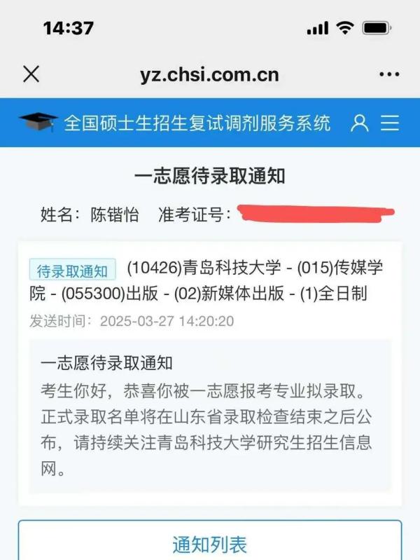 注会2103陈锴怡考入青岛科技大学