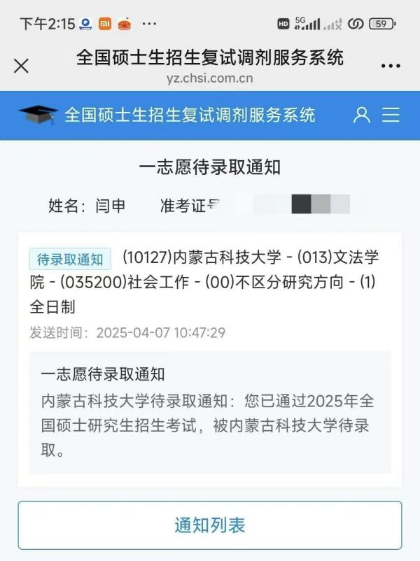 注会2110闫申考入内蒙古科技大学