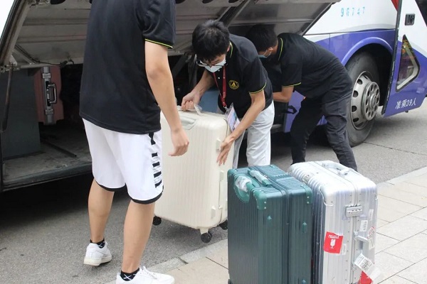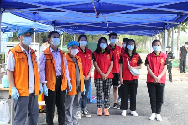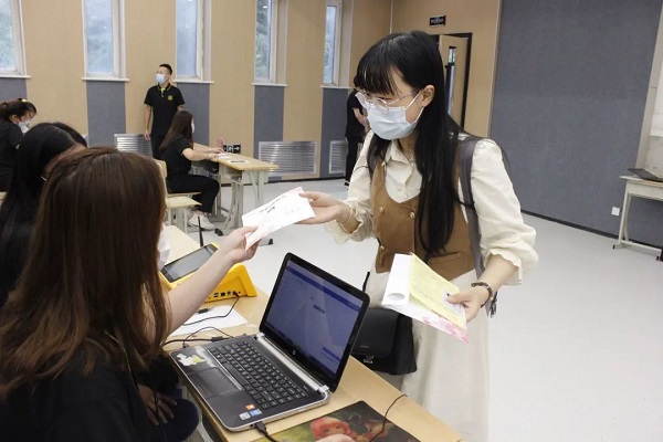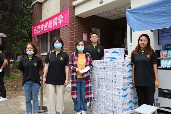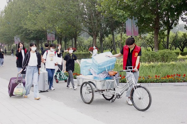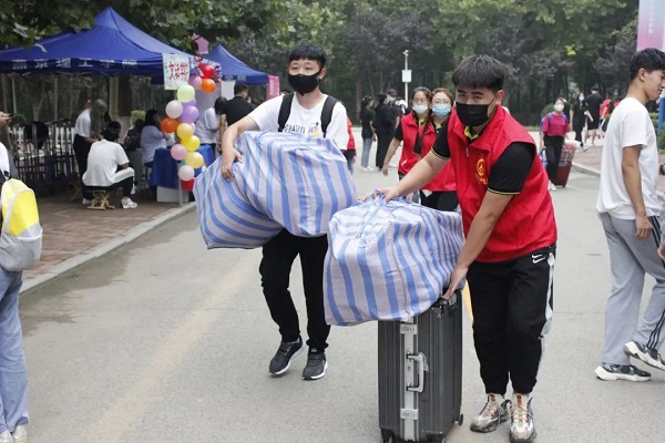 校园中到处可以看到志愿者们忙碌的身影,新生报到的每一道工序,都有志愿者们帮忙。由于疫情原因,在新生们进校之前,会有志愿者在门口为行李进行消毒、登记信息、查看进校码等等。随后,志愿者们会帮助新生帮助搬运行李,引导他们找到宿舍。老师们也都在各自的岗位上忙碌着。