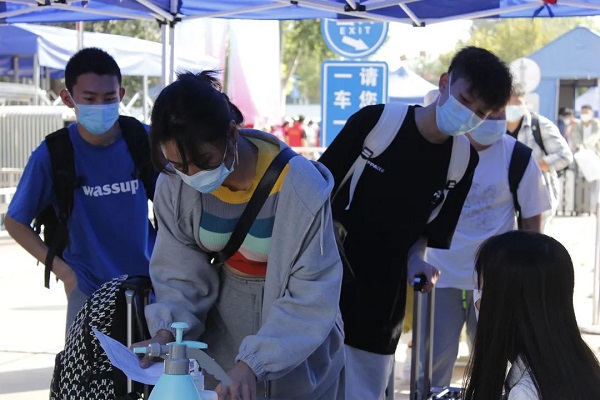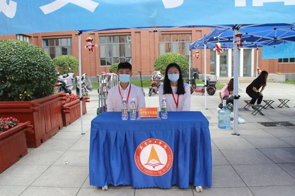 志愿者在门口准备迎新工作