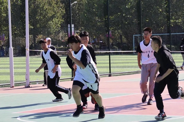 第一场5v5与3v3的两个场地攻守双方不相上下。场上的每个人都是紧张的,却总能听到队员的鼓励而放慢速度,追求稳中求胜,“团结”就此看出。上半场比赛双方11比11打平,陷入胶着状态。第二场紧接着进行,汗水在阳光下反射着光,虽有磕碰摔倒,但仍迅速站起,进入状态。