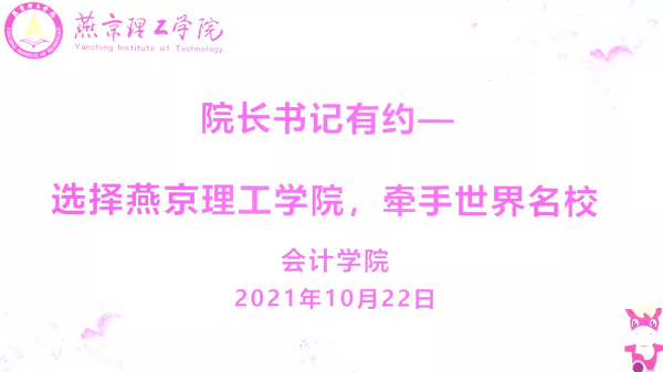 2021年10月22日,会计学院在B楼201(众创空间),举办了“院长书记有约——选择燕京理工学院,牵手世界名校”本专硕直通学业规划座谈茶话会。会计学院党总支书记胡国超、副院长史益芳,会计学院本(专)硕直通项目学生代表及2021级新生共同参与本次茶话会。