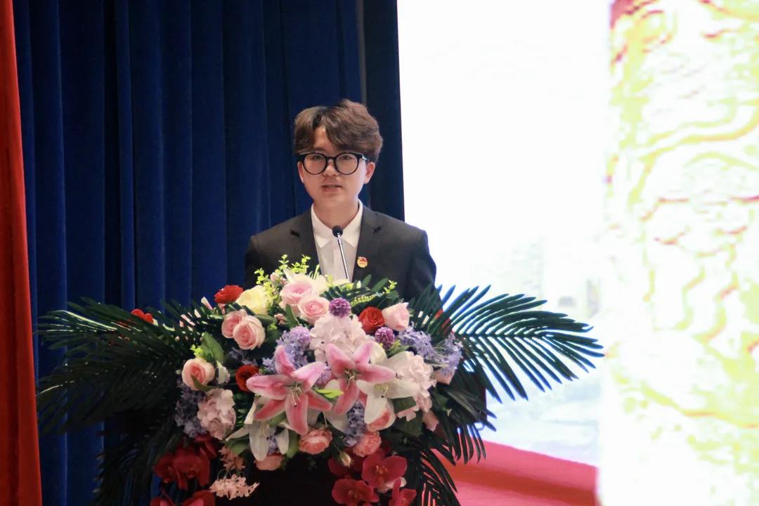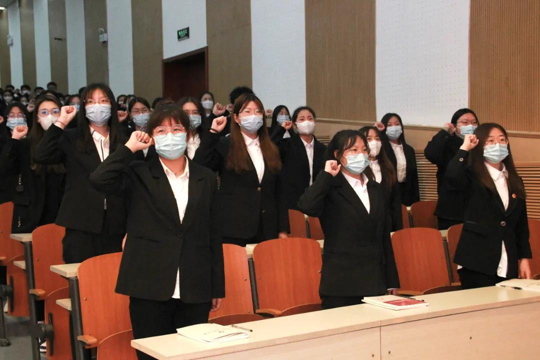 接下来是新学员代表王茯嵘同学发言并带领全体学员宣誓,她讲述了中国共产党对她的引导,并表示作为新时代青年的我们,需要牢记社会主义核心价值观,并且认真学习,领会其精神,紧跟时代的步伐,与时俱进,开拓进取。