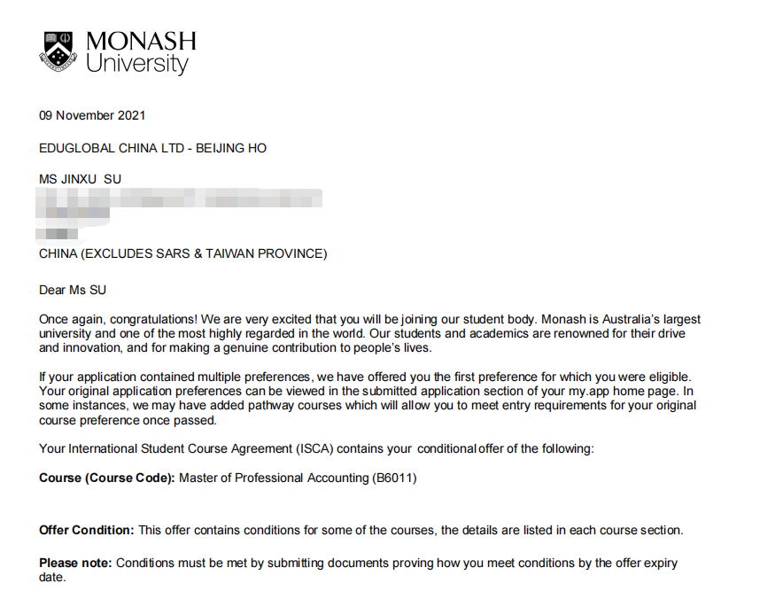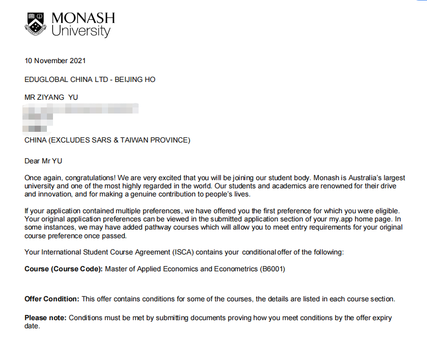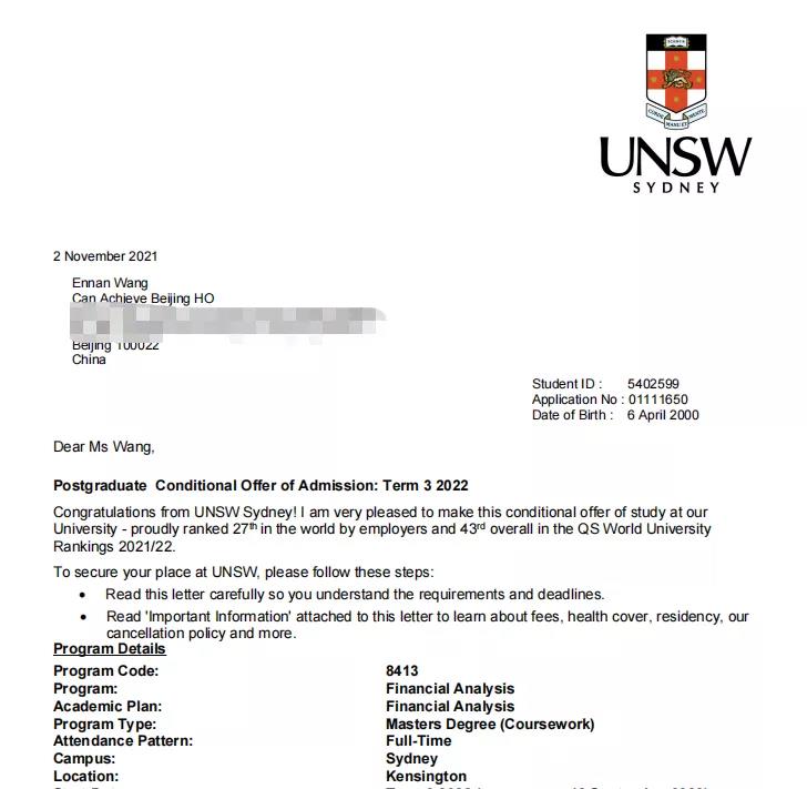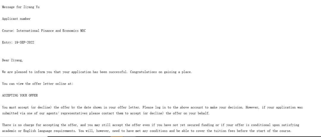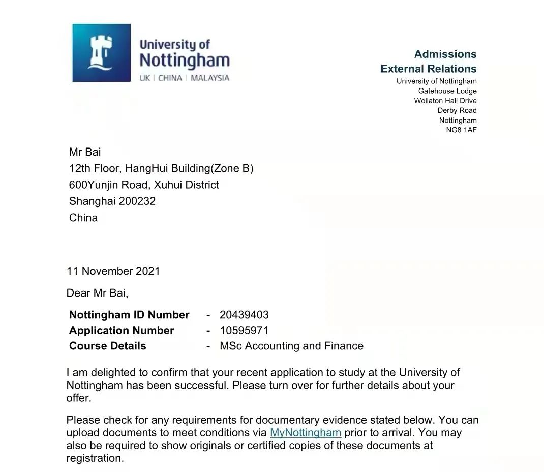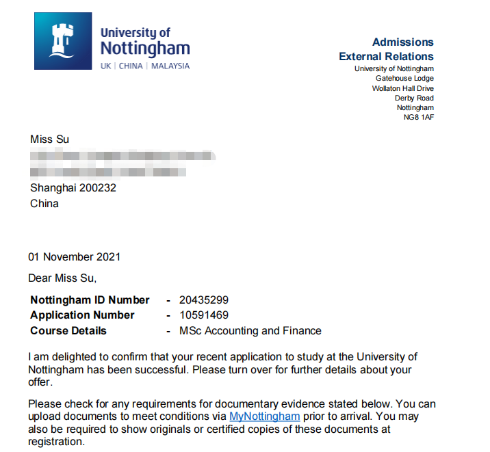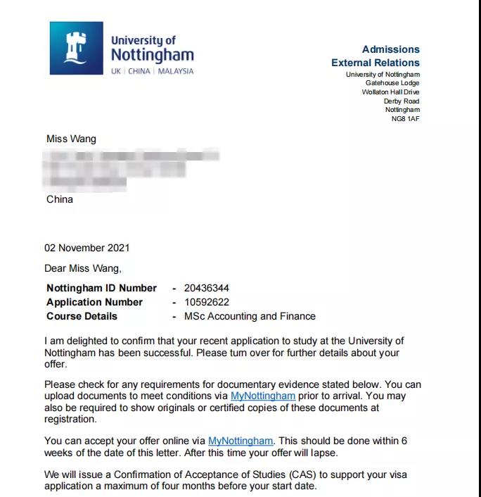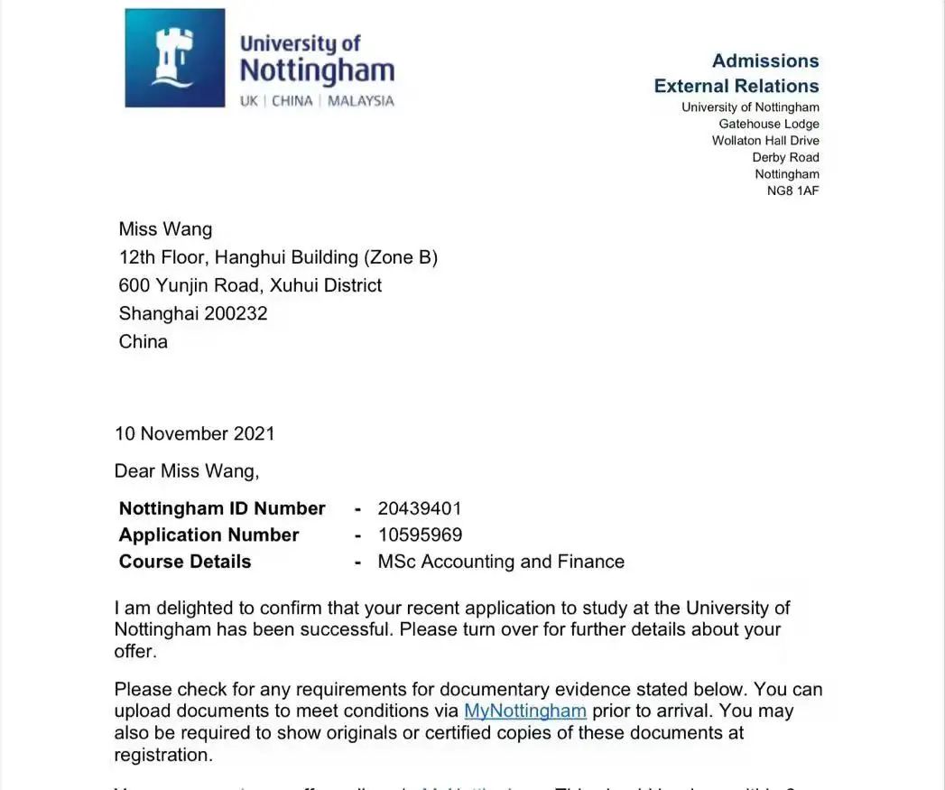 获得了诺丁汉大学(2021QS排名103)的Offer