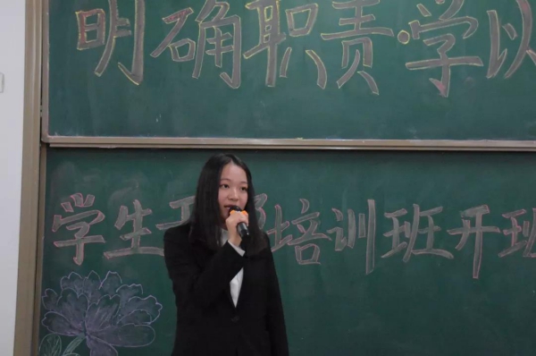之后,18级优秀学生代表、团总支网络部副部长郝雪上台发言,她提出学生干部应该有责任心,在开展活动前要仔细的筹划与组织,在活动中明确自己应如何更好的面对突发状况,在活动结束后要认真反思总结。对待工作要认真精细。随着18级学生干部代表孙傲雄带领学生干部培训班全体成员朗读誓词、庄严宣誓,开班仪式到此结束。