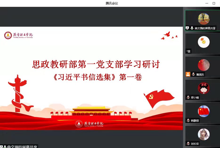 4月13日,思政教研部党总支按照《中共燕京理工学院关于认真组织学习〈习近平书信选集〉第一卷的实施意见》(党发〔2022〕12号)要求,组织全体教师通过线上会议集中学习研讨《习近平书信选集》第一卷。思政教研部各党支部紧紧围绕习近平总书记重要讲话精神,认真学习《习近平书信选集》第一卷,结合思想政治理论课教育教学实际,展开了热烈研讨。