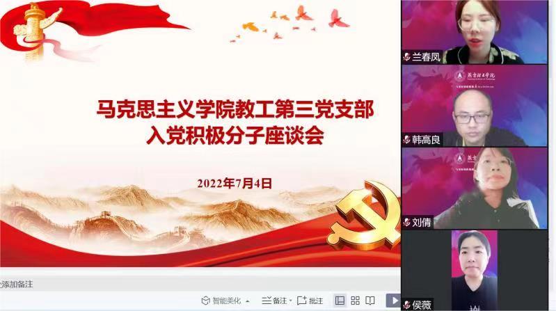 为庆祝中国共产党成立101周年,迎接二十大胜利召开,激励支部党员进一步坚定理想信念、凝聚奋进力量,马克思主义学院党总支在“七一”到来之际,开展观看“牢记嘱托,勇毅前进”2022年高校党组织示范微党课展播第4讲视频、入党积极分子座谈会和“重温入党誓词”等系列活动。