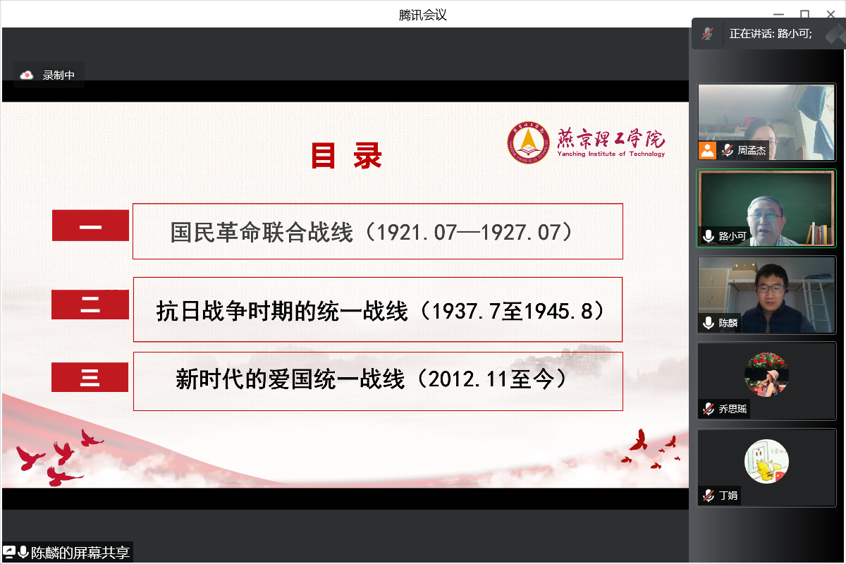 首先,陈麟老师主讲第四专题《统一战线》。这一专题围绕共产党在各个时期如何实践统一战线展开论述,内容详实,思路清晰。随后路小可教授对此进行了点评,指出要以学生为中心备课,按照学生的特点讲课,不能脱离学生讲课,之后路老师详细梳理了这一专题的内容。