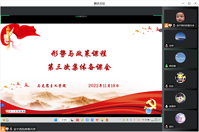 为进一步提升《形势与政策》课教学质量,11月18日上午,《形势与政策》课程组通过腾讯会议开展了第三次集体备课活动,《形势与政策》课程组全体教师参加相应授课专题的集体备课,本次备课会由燕伟璇老师主持。