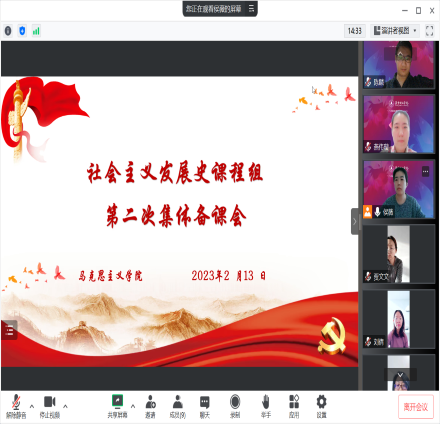 2月13日,马克思主义学院《社会主义发展史》课程组在腾讯会议线上召开了2022-2023学年第二学期《社会主义发展史》课程组第二次集体备课会,马克思主义学院副院长黄春梅和课程组全体教师参会,侯薇老师主持。