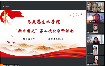 为了贯彻习近平总书记关于把学习贯彻党的创新理论作为思想武装的重中之重,同学习马克思主义基本原理贯通起来,同学习党史、新中国史、改革开放史、社会主义发展史结合起来”的重要指示精神,促进广大思政课教师深入学习贯彻习近平总书记关于党史、新中国史、改革开放史、社会主义发展史的重要论述。2月14日上午,马克思主义学院《新中国史》课程组全体教师在腾讯会议线上召开了2022-2023学年第二学期的第二次教学研讨会。