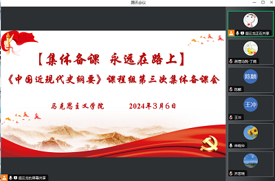 3月6日,马克思主义学院《中国近现代史纲要》(以下简称《纲要》)课程组以腾讯会议的方式召开了第三次集体备课会,课程组全体教师参加会议,会议由《纲要》课程组负责人乔思瑶老师主持。