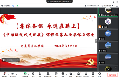 3月27日上午,马克思主义学院《中国近现代史纲要》(以下简称“纲要”)课程组通过腾讯会议在线上召开了2023-2024学年第二学期第六次集体备课会,课程组全体教师参加会议,会议由纲要课程组负责人乔思瑶老师主持。