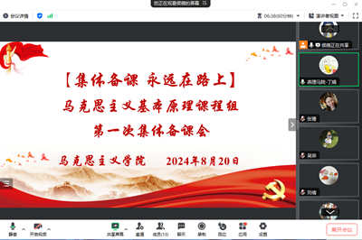为推动党的二十届三中全会精神全面融入思政课教学,提升课程建设质量。马克思主义学院《马克思主义基本原理》(以下简称《原理》)课程组,于8月20日下午通过腾讯会议平台,召开了2024-2025学年第一学期的首次集体备课会。本次会议由课程组负责人侯薇老师主持,课程组全体教师及学院领导出席,
