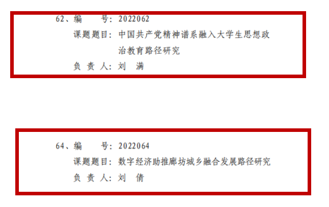 4月28日,中共廊坊市委讲师团、廊坊市社会科学界联合会印发了《关于公布2022年度廊坊市哲学社会科学研究课题立项名单的通知》(廊社联〔2022〕3号)。我院两个课题获得立项,分别是刘满老师负责的《中国共产党精神谱系融入大学生思想政治教育路径研究》(编号:2022062)和刘倩老师负责的《数字经济助推廊坊城乡融合发展路径研究》(编号:2022064)。这是我院教师在廊坊市哲学社会科学研究课题立项方面的可喜收获,一定程度上标志着我院教师的课题申报质量在稳步提升,也标志着科研水平进一步提高。