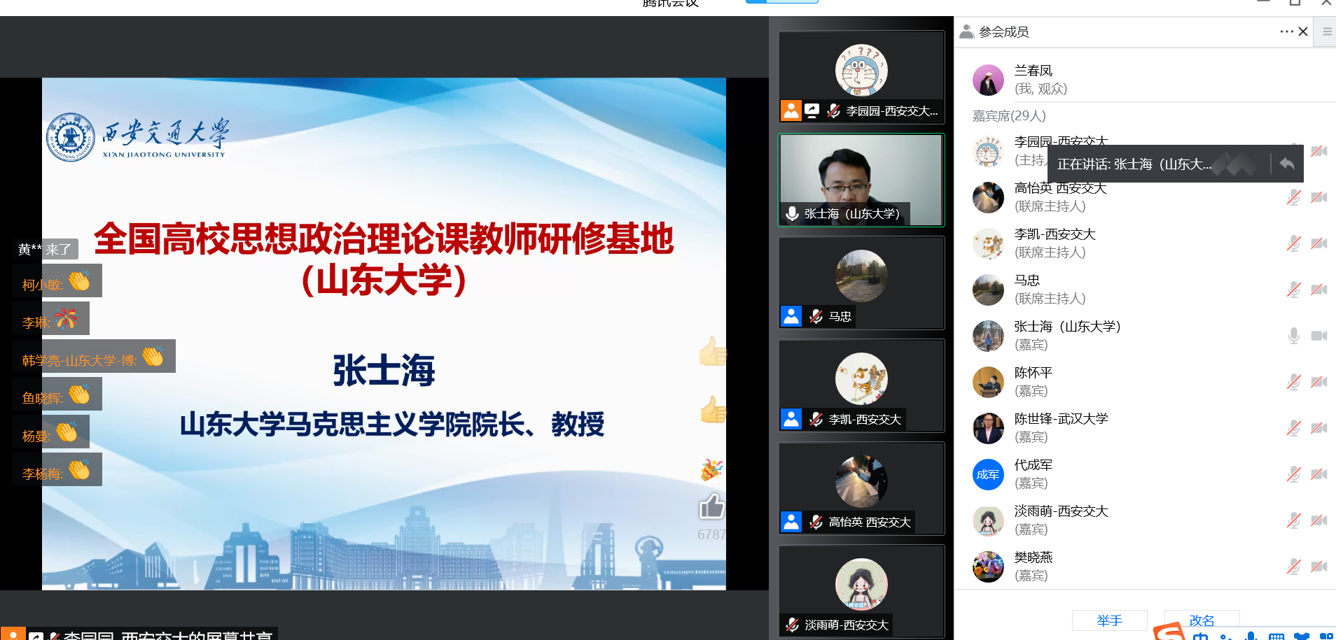 为进一步提升马原教研室全体教师教学技能和理论水平,更加高效完成教学任务,3月27日,思政教研部马原教研室全体教师在腾讯会议线上观看学习了由西安交通大学马克思主义学院主办的全国高校“中国马克思主义与当代”教学创新中心高端论坛,会议主题为全国高校“中国马克思主义与当代”教学创新中心集体备课,本次会议聚集了各大高校的专家,充分利用此次平台,进行了广泛而深入的学习交流。
