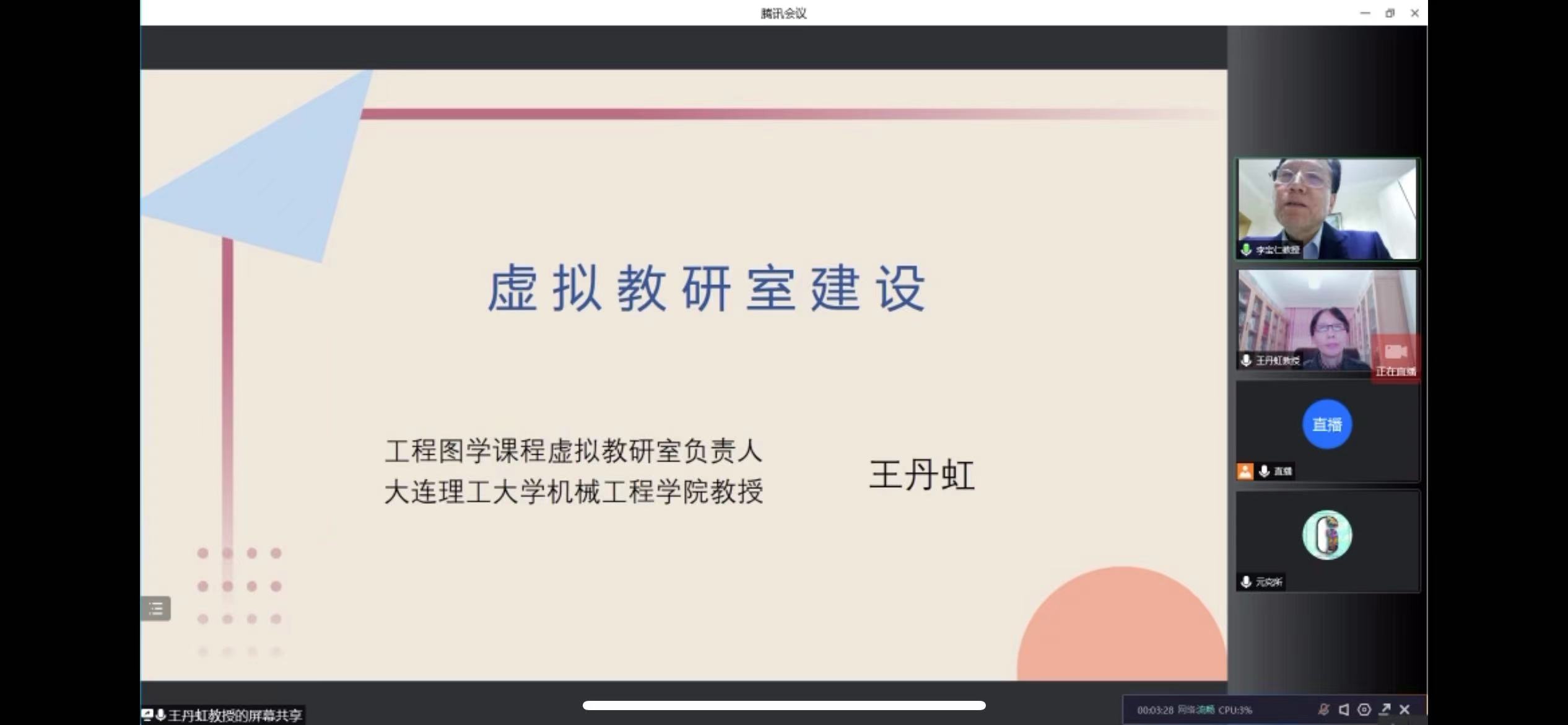 为贯彻落实《教育部高等教育司关于开展虚拟教研室试点建设工作的通知(教高司函〔2021〕10号),全面提高教师教书育人能力,探索推进新型基层教学组织建设。5月9日,马克思主义学院网络平台负责人刘倩老师组织各教研室教师观摩《虚拟教研室建设经验交流讲座》,此次讲座由工程图学课程虚拟教研室试点建设带头人、大连理工大学机械学院王丹虹教授讲授。