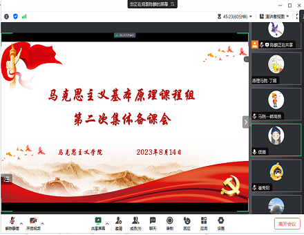 为提升思政课建设的质量与水平,推动党的二十大精神全面融入思政课教育教学。8月14日上午,马克思主义学院《马克思主义基本原理》课程组利用暑期时间,通过腾讯会议在线上召开了2023-2024学年第一学期《马克思主义基本原理》课程组第二次集体备课会,课程组全体教师参加会议,会议由马克思主义基本原理(以下简称“原理”)课程组负责人侯薇老师主持。