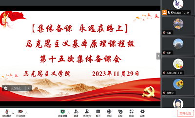 为深入学习中国式现代化理论,这一党的二十大的一个重大理论创新,科学社会主义的最新重大成果,并在授课中与马克思主义基本原理第六章内容结合起来,深刻领悟“两个确立”的决定性意义,牢记“国之大者”,增强“四个意识”、坚定“四个自信”、做到“两个维护”。11月29日上午,《马克思主义基本原理》课程组通过腾讯会议在线上召开了2023-2024学年第一学期第十五次集体备课会,课程组全体教师参加会议,会议由马克思主义基本原理(以下简称“原理”)课程组负责人侯薇老师主持。