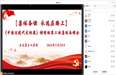 为丰富课程资源,打造高效课堂,稳步提升《中国近现代史纲要》教学质量,2月28日,马克思主义学院《中国近现代史纲要》课程组召开了2024年春季学期第二次集体备课会,本次会议由纲要教研室主任乔思瑶主持,《中国近现代史纲要》课程组全体教师参加。