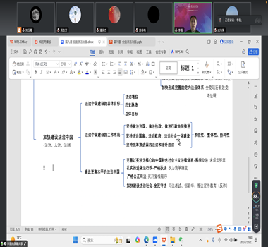 本次集体备课会由李淑清、翟霖森与李薇三位老师分别进行说课。李淑清老师围绕第六章“推动高质量发展”进行说课。李淑清老师从“完整、准确、全面贯彻新发展理念”“坚持和完善社会主义基本经济制度”“加快构建新发展格局”“建设现代化经济体系”四个层面展开说课。为了增强讲授的逻辑性和连贯性,李老师在章节具体内容的整理方面给每一节的段落以问答式的方式做了重新排列并添加了小标题,比如:什么是新发展阶段?新发展阶段提出的依据和过程是什么?正确把握新阶段有什么意义?新发展阶段为什么需要新发展理念?接着,翟霖森老师围绕第八发展全过程人民民主”进行说课。翟霖森老师从“坚定中国特色社会主义政治制度自信”“全过程人民民主是社会主义民主政治的本质属性”“健全人民当家作主的制度体系”“巩固和发展新时代爱国统一战线”四个层面展开说课。李薇老师围绕第九全面依法治国”进行说课。李薇老师从“坚持中国特色社会主义法治道路”“建设中国特色社会主义法治体系”“加快建设法治中国”三个层面展开说课。李老师按照教材的顺序,结合这一章的思维导图给老师们进行了梳理,并列举了一些案例。三位老师的备课充分,运用各种教学手段、教学方法和教学案例,精心为学生“烹制”色香味俱全的精品课,切实提升思政课的亲和力和针对性。