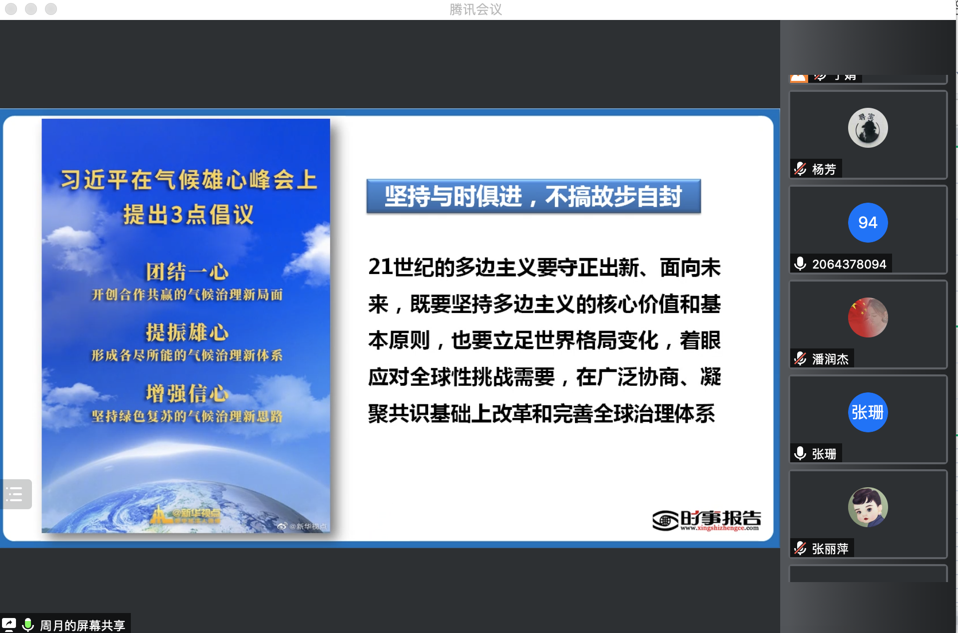 首先,周月老师就第四专题——多边主义世界发展的破局之策进行说课,从当今时代面临的四大课题、照亮前行之路的多边主义、践行多边主义的中国行动展开,逻辑清晰,内容连贯。董术教授就说课内容进行指导,在教学内容设计方面,应包含什么是多边主义、为什么要搞多边主义、怎样搞多边主义以及多边主义发展趋势这四个方面;在教学设计方面,应注意学生对教学内容的可接受性、要对学生因材施教、要提高课堂教学抬头率、要培养学生能力、要注意教学内容的关联性、要进入学科前沿,介绍最新的相关形势政策动态(例如,习近平总书记与拜登视频会晤,习近平总书记对多边主义的最新阐述)、要学习教育教学法文献、观摩全国思政课讲课比赛、要锻炼和提高教学研究能力和科研能力等方面的把握。最后,与会教师进行探讨,交流分享自身经验和相关建议,把好的素材在群里进行交流分享。