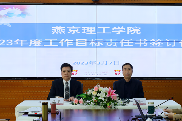 3月7日,燕京理工学院2023年度工作目标责任书签订仪式在综合办公楼428会议室举行。学校领导杨庚宇、朱代春、刘元园、王传超、吴汶燕、宋伟、吴敏、赵鹏和全体中层干部参加了会议。会议由校长杨庚宇主持。
