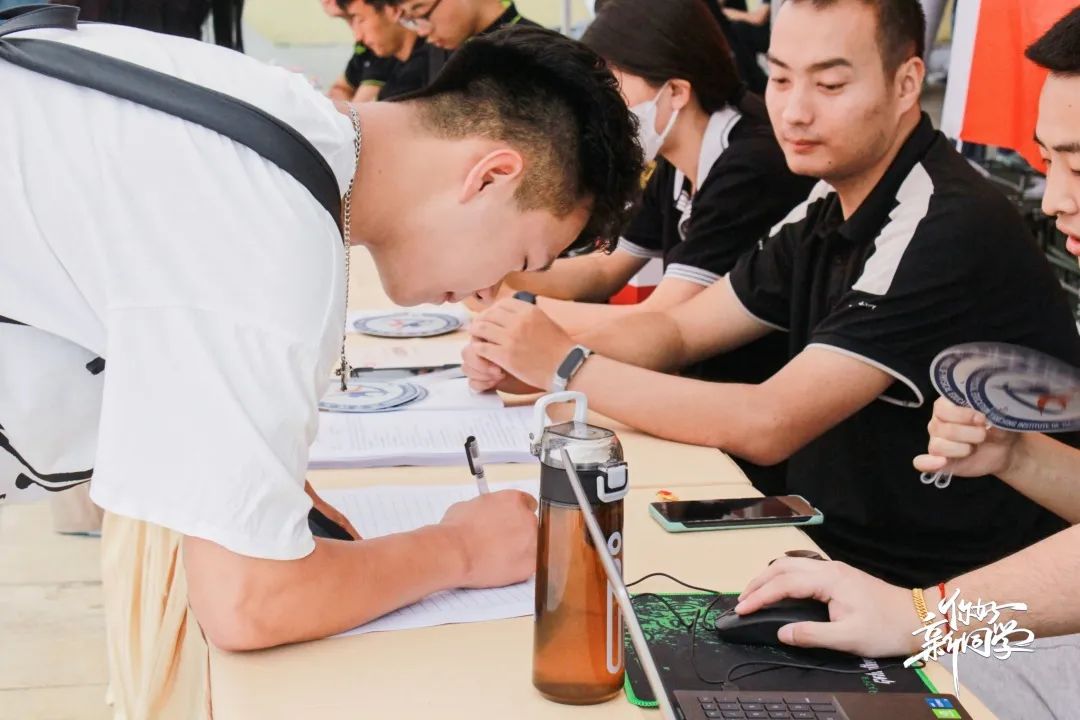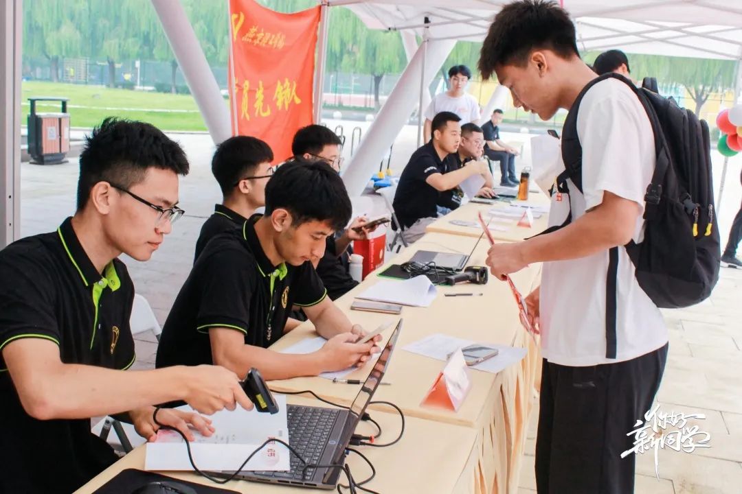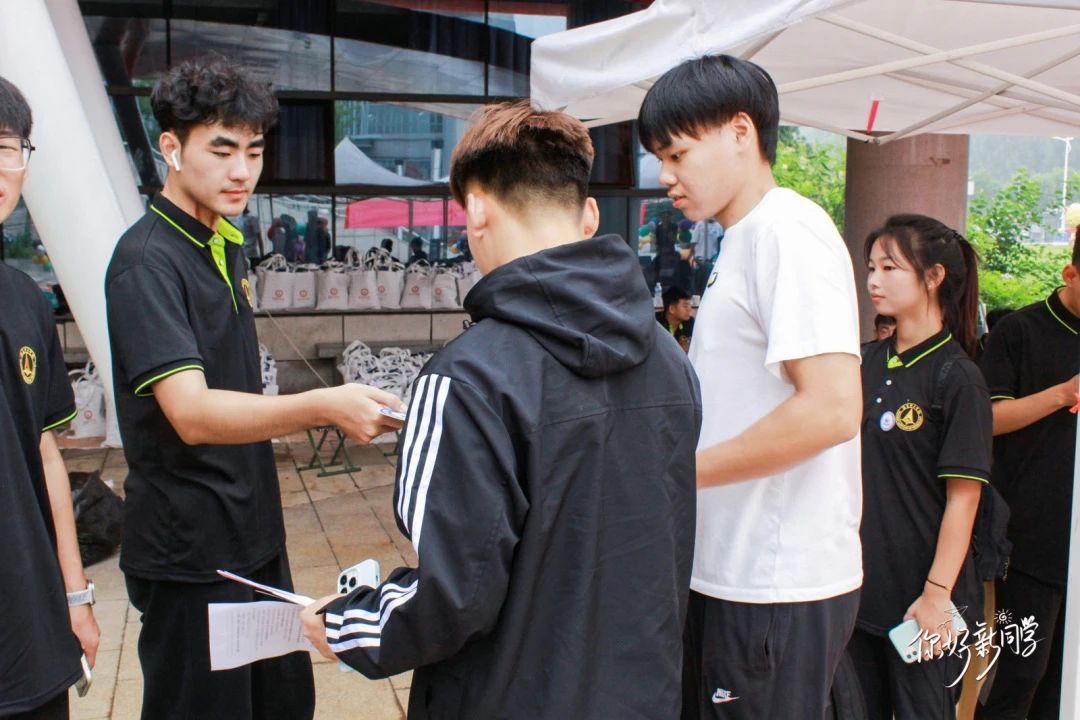 满心欢喜,一见倾“新”。晨曦推走夜晚,初阳跃出地面。师生志愿者早早着装守候在车站,指引着方向,忙碌在校园。汗水沸腾身上,笑容洋溢脸上。学院老师和志愿者为来到学校的第一位同学颁发一个暖心小礼物—保温杯,并为这位同学拍下入学第一天的美好记忆。志愿者们为新生报到保驾护航,让等待少一分煎熬,多一份温馨。引导新生前往宿舍办理入住手续
