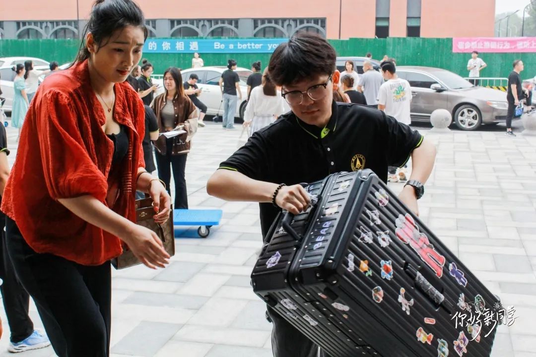 志愿者们积极热情地帮助新同学搬运行李,他们坚守岗位,尽职尽责,确保新生能够正常入校,志愿者们以自己的无私奉献,向新生传递温暖。