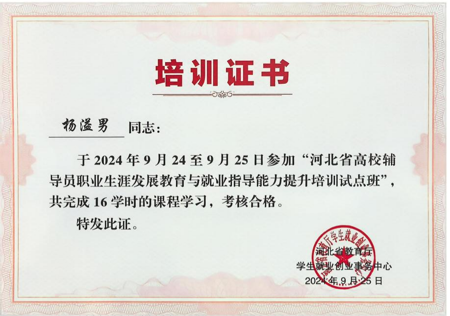 (体育学院新闻中心)为贯彻落实教育部有关工作部署,着力强化河北省高校辅导员队伍职业生涯教育与就业指导能力,促进高校毕业生就业指导与服务工作水平稳步提升,2024年9月24日至25日,在学校及学院的大力支持下,体育学院辅导员杨溢男参加了在沧州举办的河北省高校辅导员职业生涯发展教育与就业指导能力提升培训试点班。