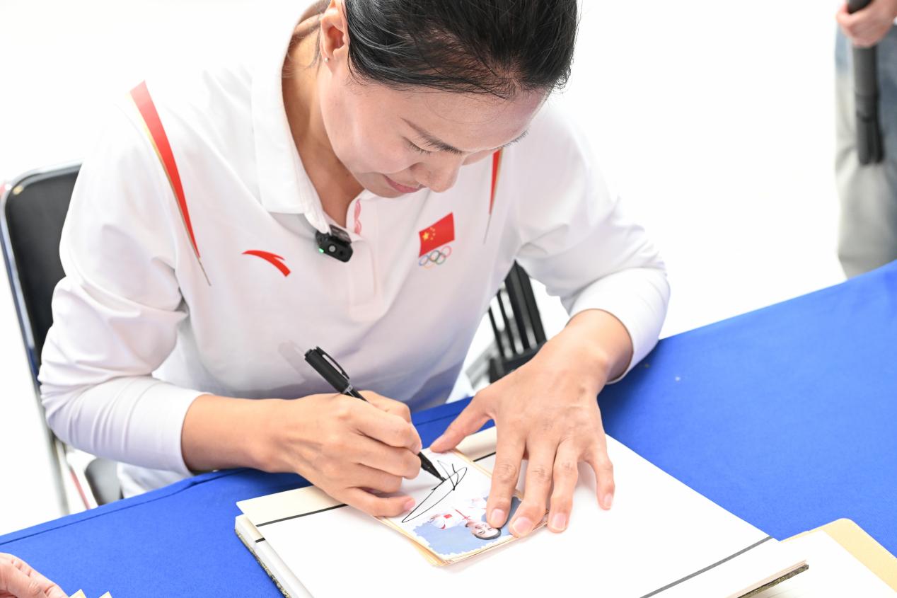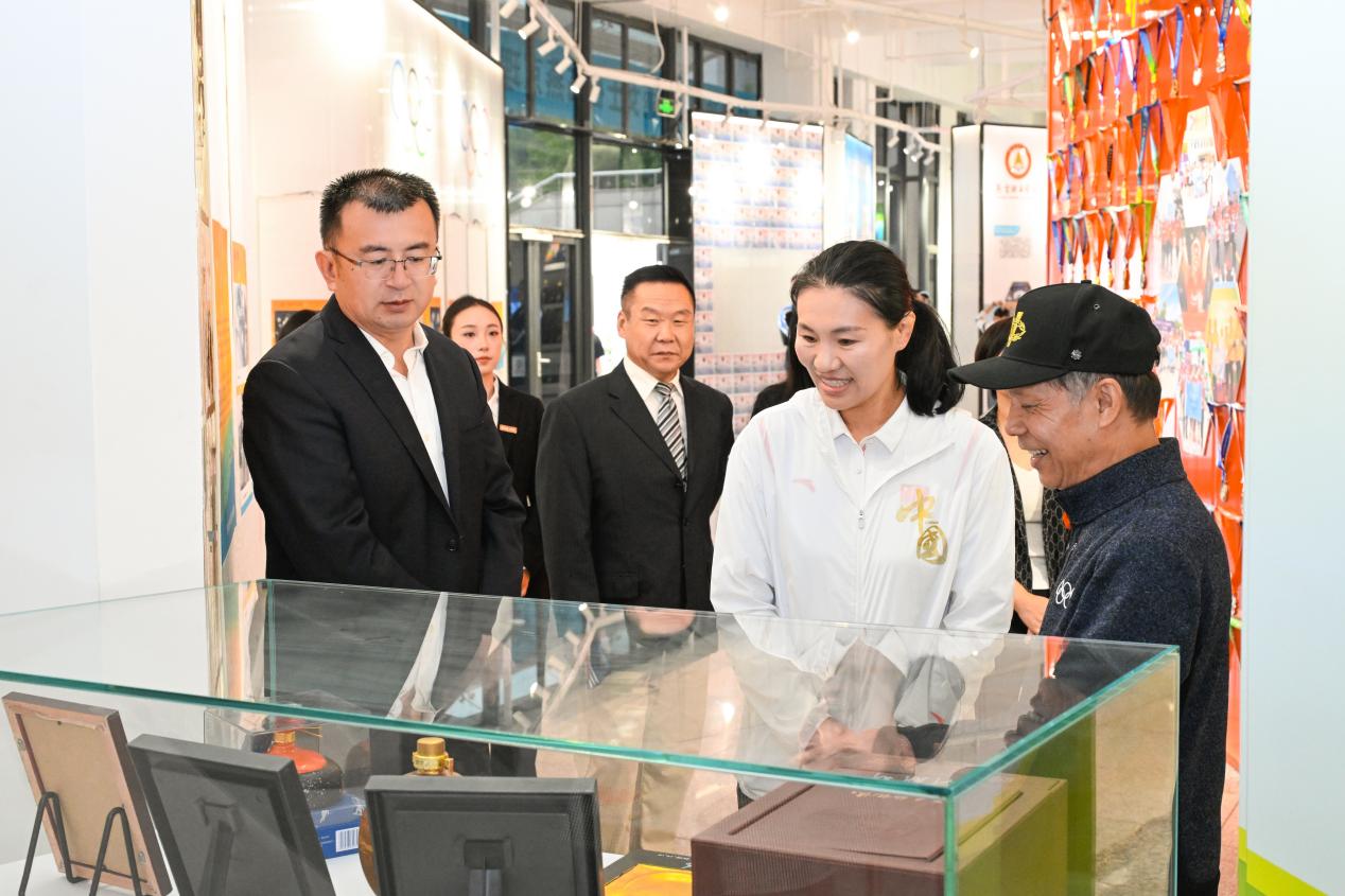 在随后的专访中,杨秀丽女士回顾了自己的运动生涯,她不仅分享了夺冠路上的艰辛与喜悦,更以亲身经历诠释了体育精神的真谛——它不仅仅是强健体魄的磨砺,更是坚韧不拔的意志、勇于挑战的勇气和为国争光的崇高信仰。她的讲述深深触动了在场的每一个人,让大家深刻感受到体育精神所蕴含的巨大力量与无限魅力。在体育名人坊前,杨秀丽女士留下了珍贵的合影并印下冠军手印。