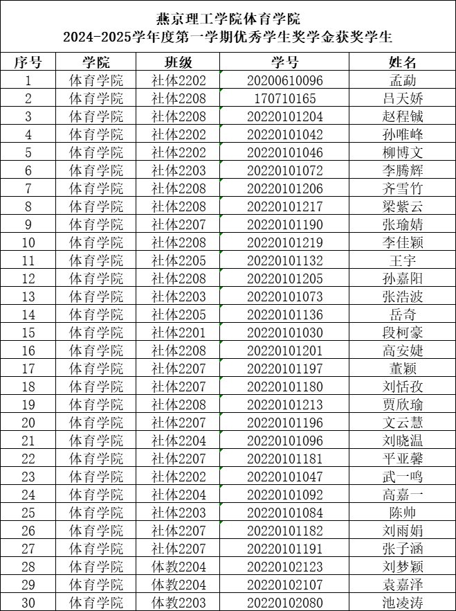 经学生本人申请,评审小组评定,学院审核,拟推荐社会体育指导与管理2202班孟勐等174人为2024-2025学年第一学期优秀学生奖学金获奖者。现将优秀学生奖学金获奖学生情况予以公示,请广大师生对公示情况进行监督。