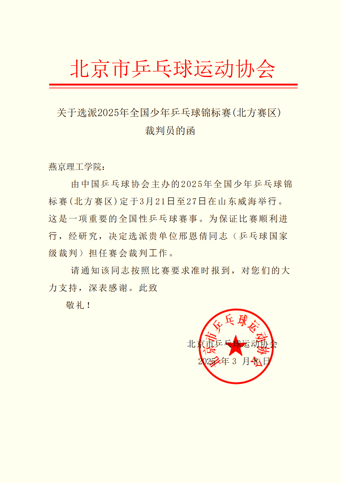 体育学院教师邢恩倩参加2025年全国少年乒乓球锦标赛(北方赛区)执裁工作