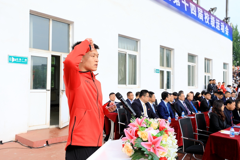 裁判员代表孟少彬、运动员代表陈永皓在主席台上向全校师生宣誓。