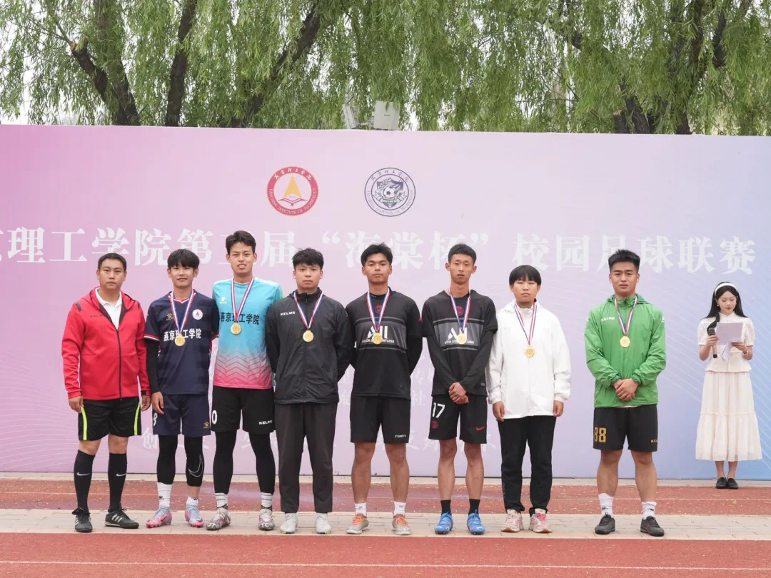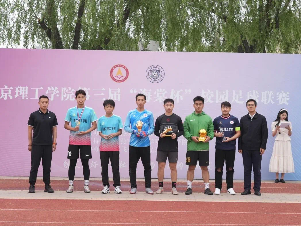 获得最佳新秀奖的是董泽宇;获得最佳进球奖的是李开朗;获得金手套奖的是李森;获的金靴奖的是张振;获得金球奖的是静英铭。由燕京理工学院学生处处长宣银和体育学院副院长李斌进行颁奖。