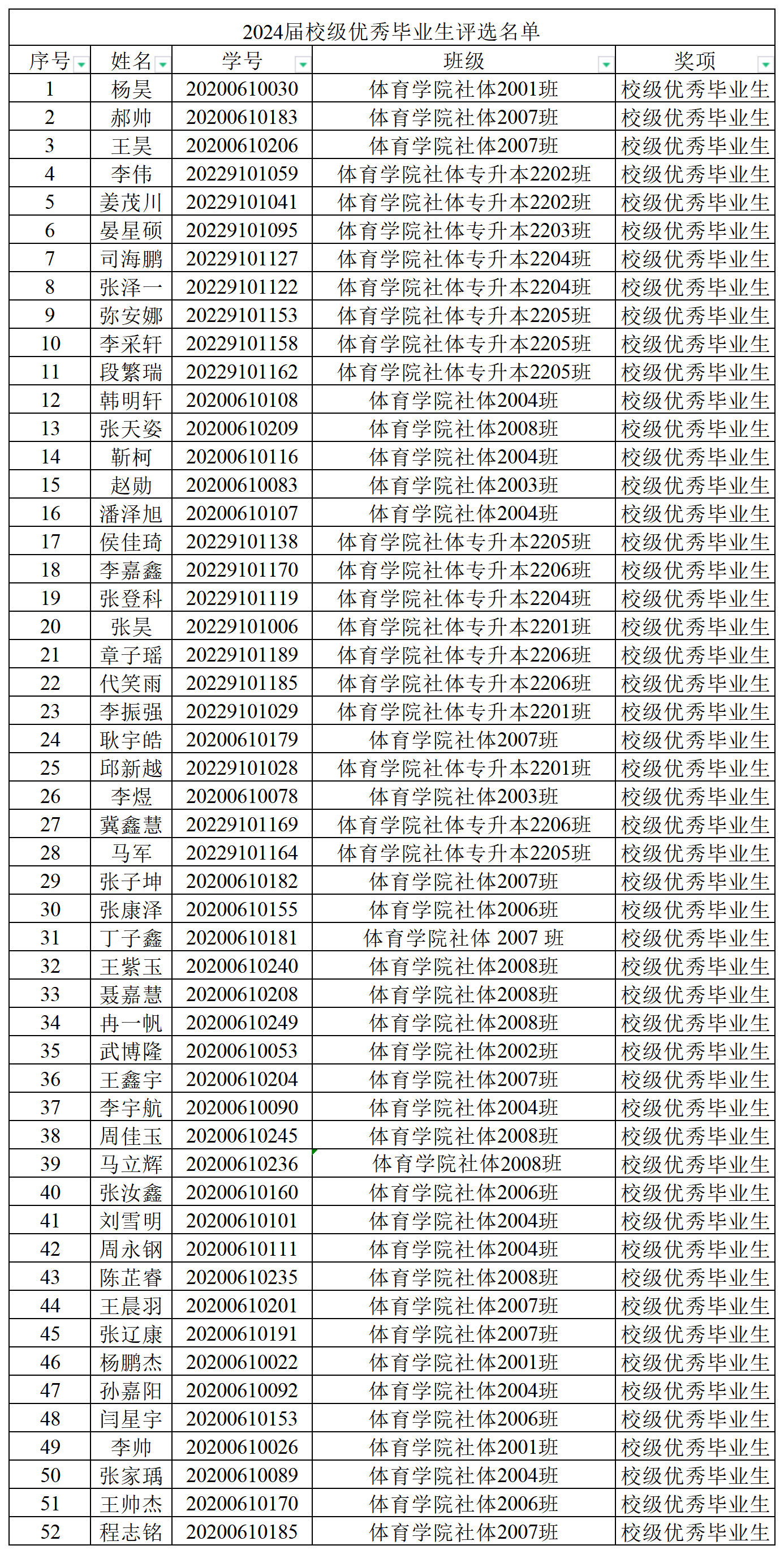 经学生本人申请,评审小组评定,学院审核,拟推荐社体2001班张波等52名同学为2024届校级优秀毕业生(详见附件1)。现将2024届校级优秀毕业生情况予以公示,请广大师生对公示情况进行监督。