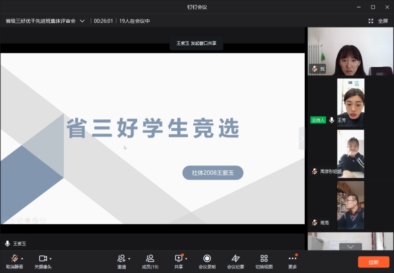 评选会秉持公平公正公开的原则,在学生工作部门老师的监督下,经过班级民主投票、学院对候选人综合情况的讨论及投票后,拟推荐社体2008班王紫玉同学为河北省级“三好学生”候选人;社体1908班杨若澜同学为河北省级“优秀学生干部”候选人;社体1908班为河北省级“先进班集体”。