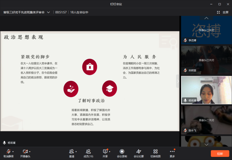 在评选汇报中,我院11名参选学生分别从思想、学习、工作、生活和所获荣誉奖项等情况进行介绍,展现了良好的精神风貌和青春风采。