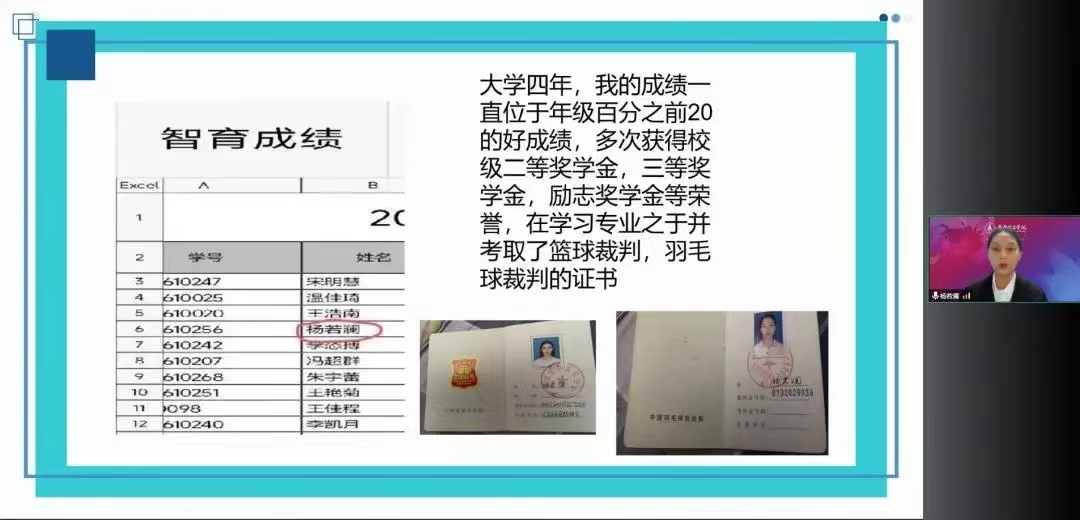 每位候选人在校期间刻苦努力、脚踏实地,以辛勤的汗水充实着自己,通过获得的各种优异成绩和积累的丰富实践经验,向评审老师们展示着自己的优异成果,展示着体院学子积极向上的精神面貌。