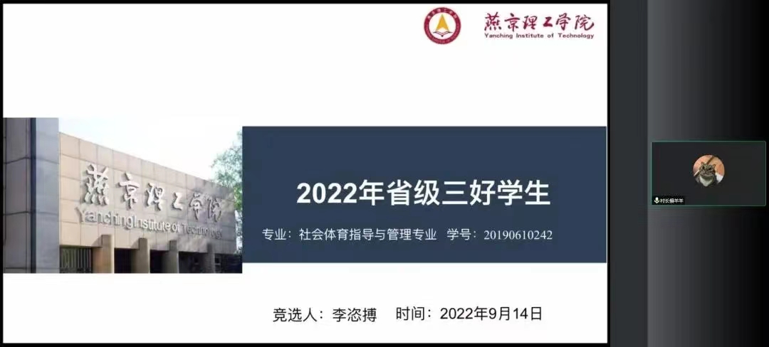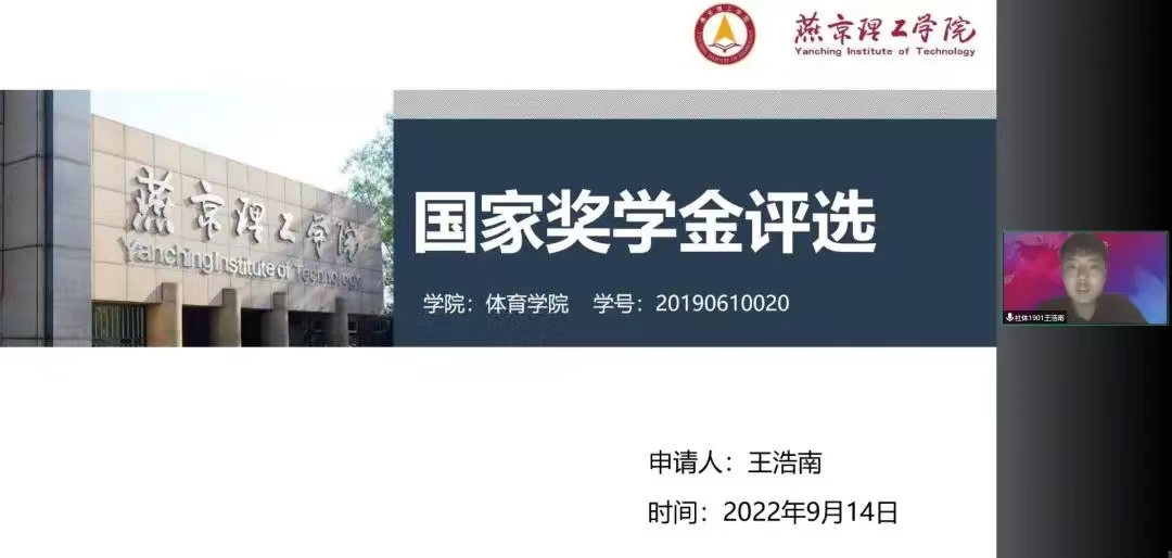 为倡导优良学风,树立先进典型,将评奖与育人工作相结合,发挥优秀学生的示范引领作用,9月14日下午,燕京理工学院体育学院依托腾讯会议平台,组织召开2021-2022学年国家奖学金评审会。参加本次会议的评委有体育学院党总支书记李斌、学工处奖助贷负责人高茏、体育学院全体辅导员及全体参评学生。