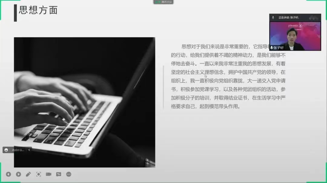 评审会通过学生申请、评审小组评议最终选出八名国家奖学金候选人。八名候选人分别以PPT的形式从思想道德、学习成绩、部门经历、社会实践等方面展示了他们在校期间的学习成长历程,通过优异的学业成绩,班级贡献、组织工作以及丰富多彩的文体实践活动展现自己的综合实力。