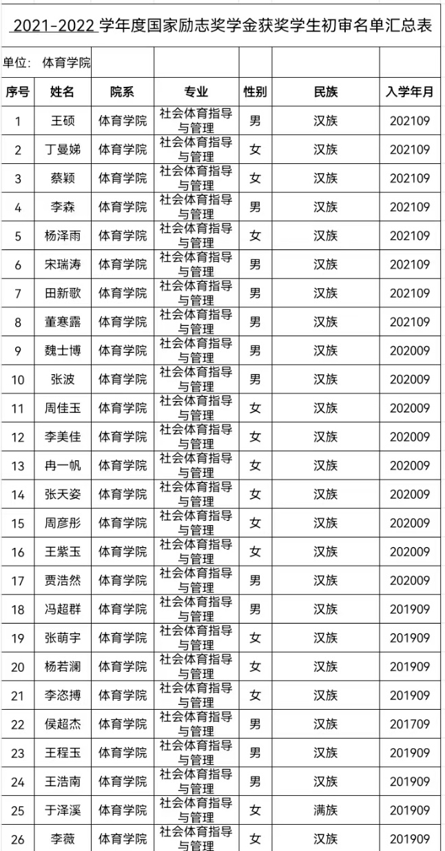 体育学院2021-2022学年度国家励志奖学金及2022-2023学年度国家助学金初评结果公示