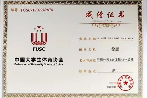 由中国大学生体育协会主办、体育舞蹈分会执行的“2022年中国大学生体育舞蹈(团体舞)”线上赛落下帷幕。在蒋帅、宋雨竹两位教师的指导下,我校体育舞蹈运动队队员获“甲组校园恰恰集体舞”、“甲组校园牛仔集体舞”一等奖。
