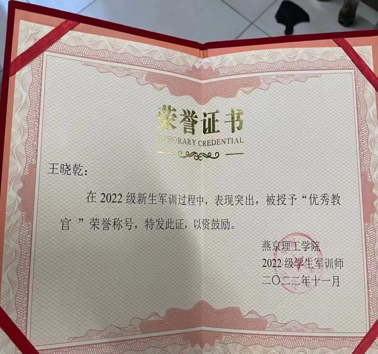 2022年11月参加燕京理工学院新生军训获得“优秀教官”。