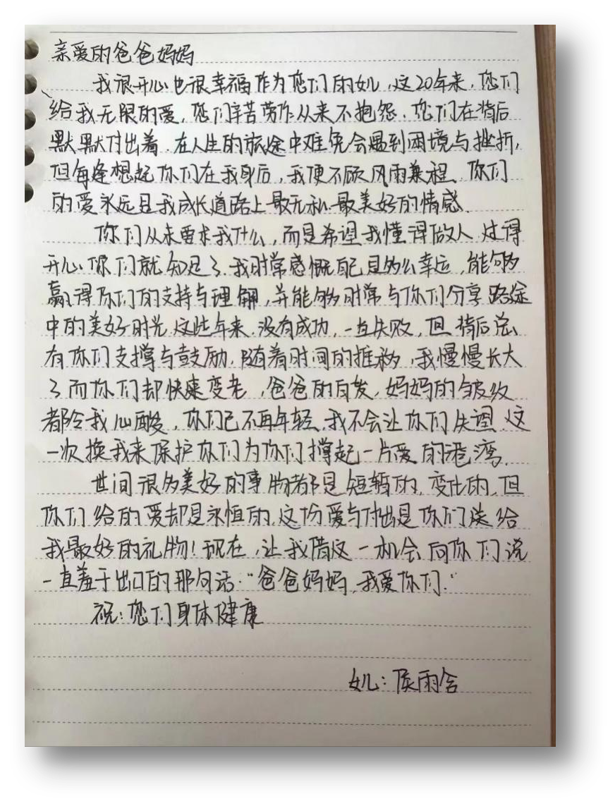 随着时间的迁移,书信成了这个时代少有的浪漫与温柔。写一封家书,传递浓浓的亲情;写一封家书,给予厚厚的温暖。随着活动的深入开展,一封封散发着温馨的信笺,一句句表达真挚感情的话语,让我们再次体会到了感恩教育的温暖。