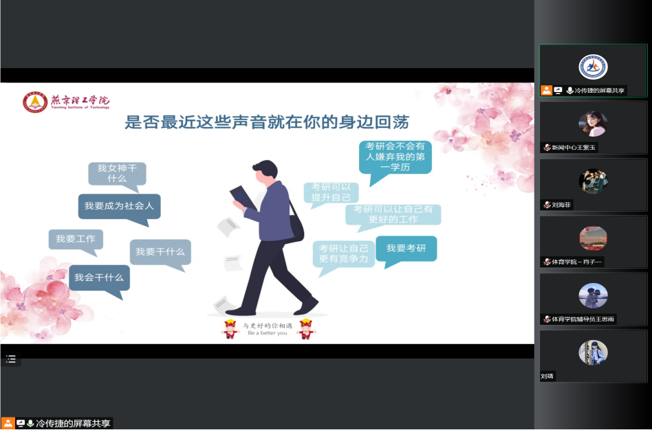 为贯彻落实“高端化、国际化、个性化”的发展战略,使更多的学生及家长认识、了解海外深造项目。2月17日,体育学院于腾讯会议举办体育学院学业生涯规划家长座谈会。国际教育学院院长吴仲元、体育学院院长肖子一、党总支书记李斌、全体辅导员及有意向的学生和家长参加本次座谈会。会议由辅导员冷传捷主持。