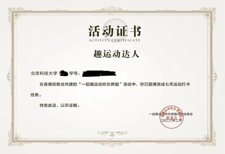 参与同学活动期间,参与同学完成连续7天运动打卡即可获得“趣运动达人”活动证书。