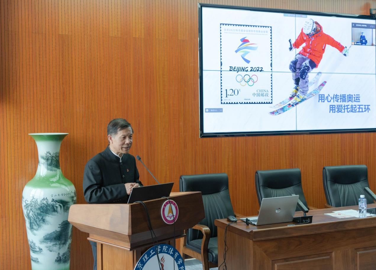 原国家体育总局体育文化发展中心退休干部、北京收藏家协会体育收藏品专业委员会主任刘超英在题为《用心传播奥运,用爱托起五环》主题讲座中,围绕“结缘奥运在长城、奥运情深长卷长、体育收藏水到渠成、二会萨翁不了情、冬奥有我梦在心中”五个方面展开讲解。刘超英老师结合自身建长城卷、体育收藏的工作经历,鼓励学院师生深入了解和探索奥林匹克精神。他希望能以冬奥为窗口,展现中华文明。