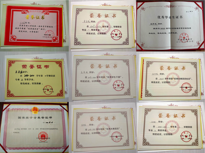 坚定且上进,不满足于现状,也不会拘泥于未来,是王子龙同学的真实写照。他在生活中去践行任务表上的清单,为自己的目标铺平道路。大学四年的时光里,他在学业上刻苦努力,四年成绩一直名列前茅,并获得了省级优秀毕业生、国家励志奖学金及校级奖学金等荣誉。